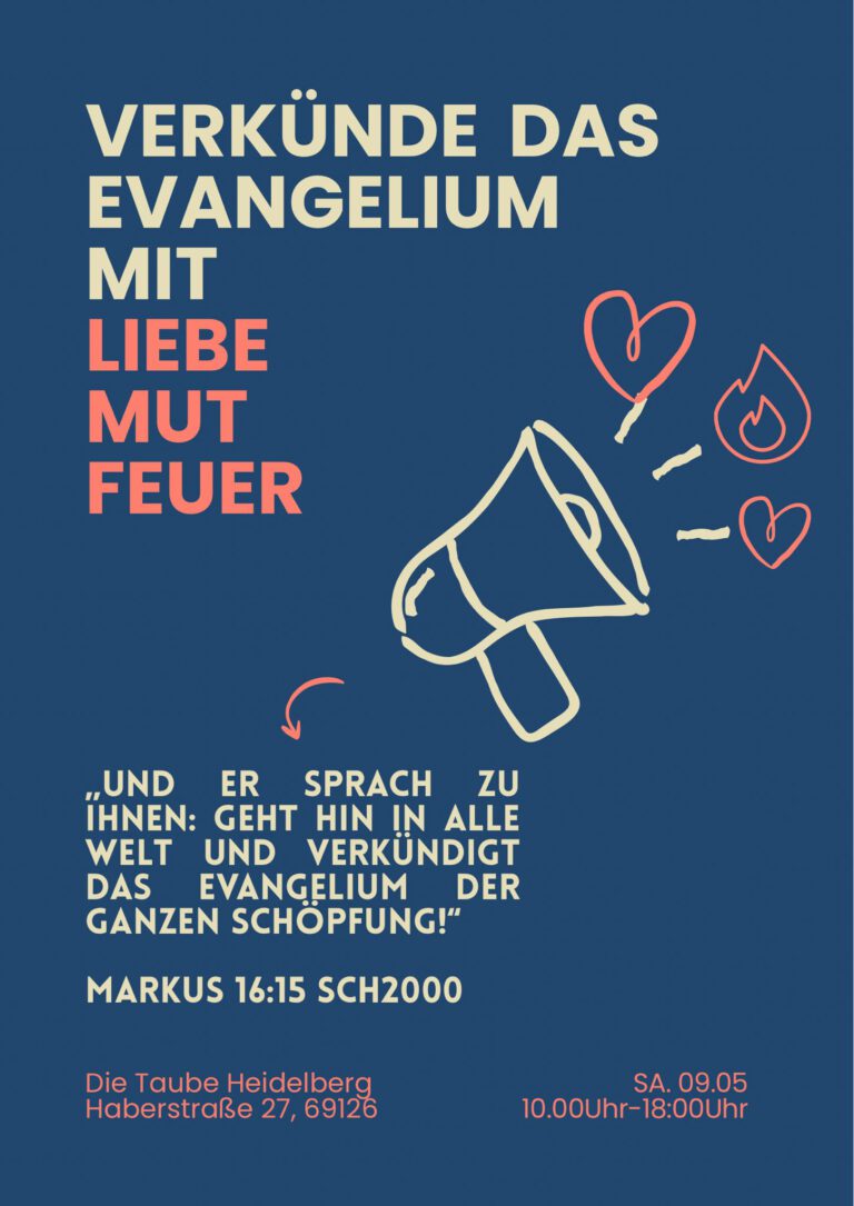 Du möchtest die frohe Botschaft des Evangeliums verkünden und erleben, wie Menschen gerettet werden und Jesus begegnen, weißt aber nicht, wie du ein Gespräch beginnen oder das Evangelium in seiner Fülle vermitteln sollst? Dann komm zu diesem Training und empfange geistliche und praktische Impulse, um das Evangelium mit Liebe und Feuer weiterzugeben. Egal wie alt oder jung du bist, du kannst dein Umfeld verändern!